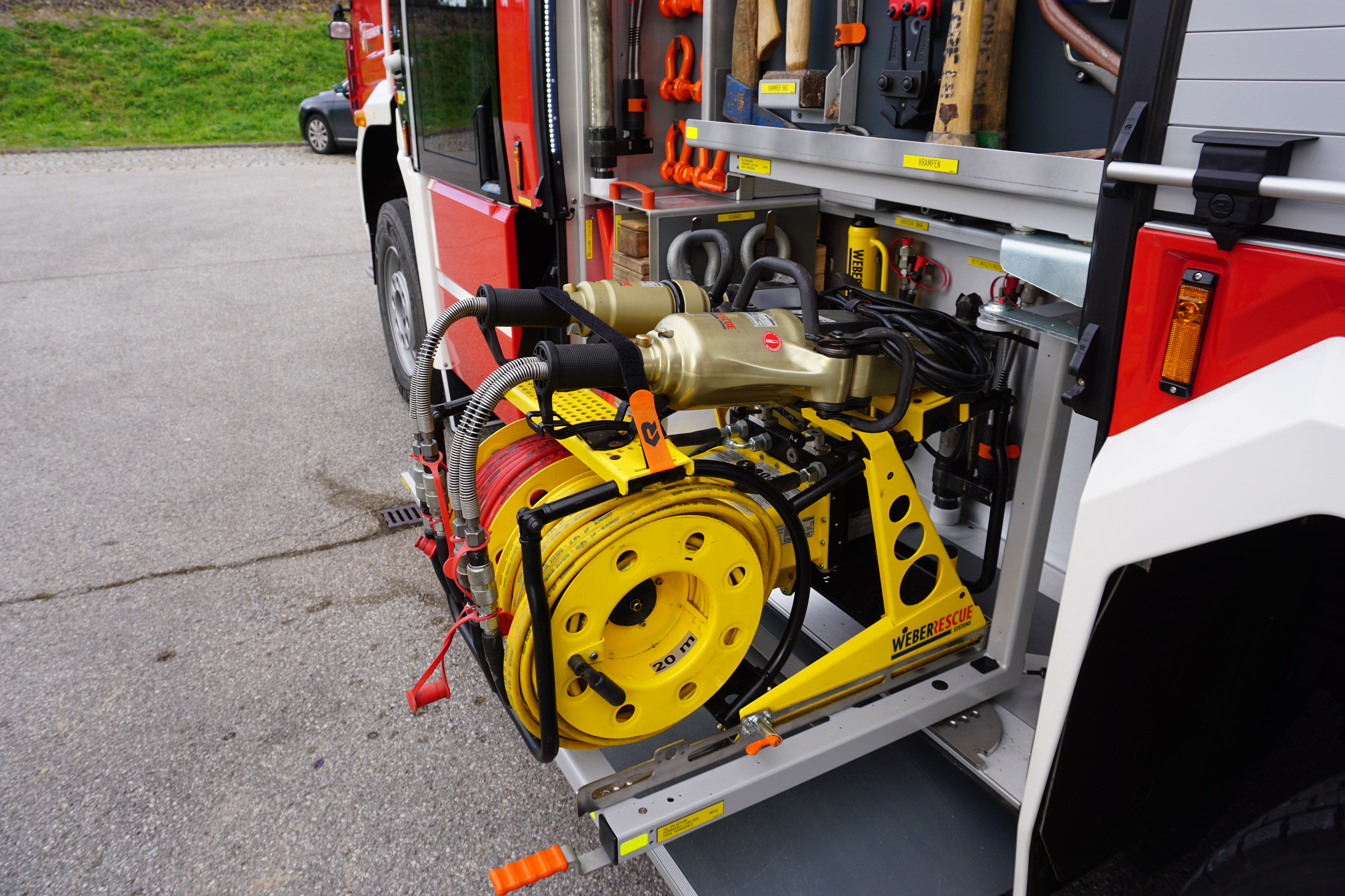 Mit dem hydraulische Rettungsgerät könnten eingeklemmte Personen mittels Spreizer und Schere aus verunfallten Fahrzeugen gerettet werden. Das hydraulische Rettungsgerät wird im RLFA 2000 mitgeführt.