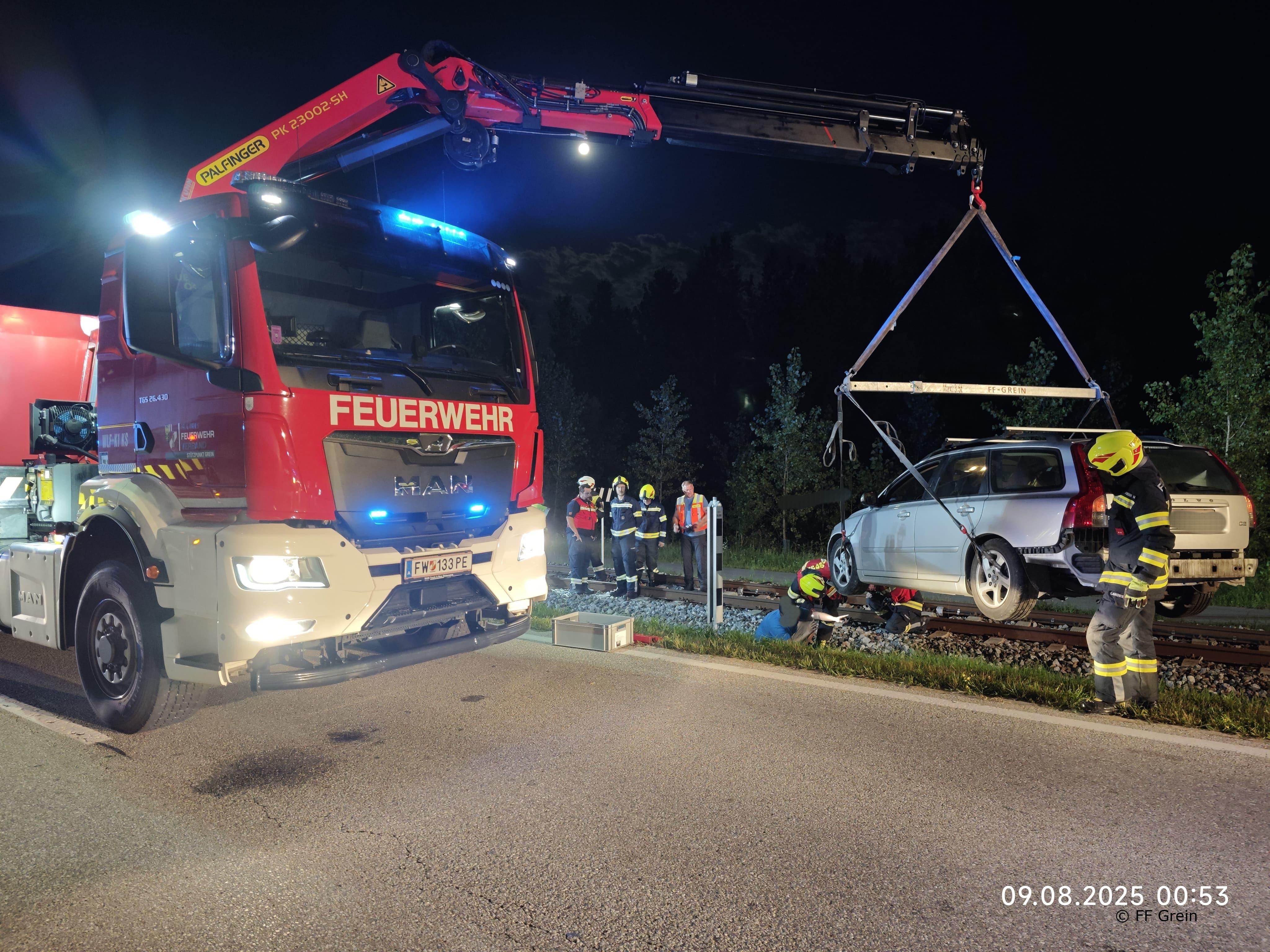 Am Samstag kurz nach Mitternacht wurde die Freiwillige Feuerwehr Grein mit dem Stützpunktfahrzeug WLF-K1-KS von der FF-Saxen nachalarmiert.Die Infos auf den Personenrufempfängern lautete: „WLF wird benötigt - PKW auf den Schienen“. Sofort machten sich das WLF-K1-KS und das KDO auf den Weg zum Einsatzort. Im Bereich der B3 Donaubundesstraße in der Gemeinde Saxen Höhe Wetzelsdorf kam ein PKW-Lenker von der Fahrbahn ab, und landete mit seinem Fahrzeug auf den Gleisen. Mittels Kran konnte der PKW ohne weiteren Schäden wieder auf die Fahrbahn verbracht werden. Somit war der Einsatz für uns beendet und rückten gegen 01:20 Uhr wieder ins Feuerwehrhaus ein, wo wir die Einsatzbereitschaft wieder herstellten. Weitere Einsatzkräfte: Freiwillige Feuerwehr Saxen Freiwillige Feuerwehr Reitberg Polizei Grein ÖBB-Einsatzleiter
